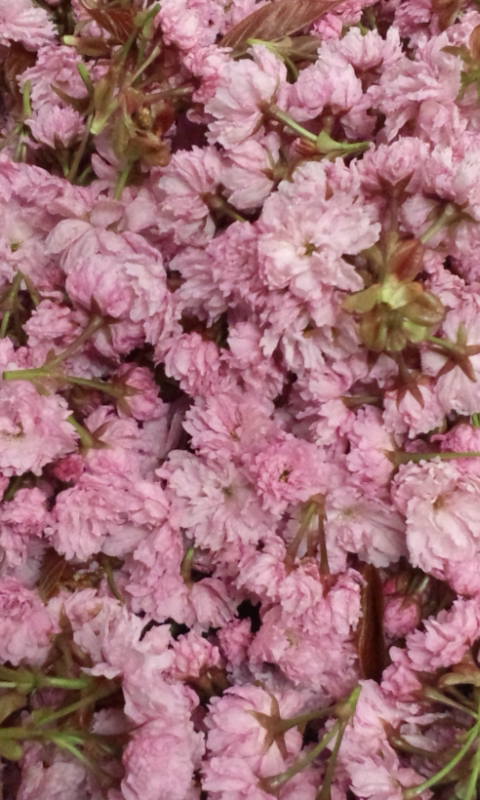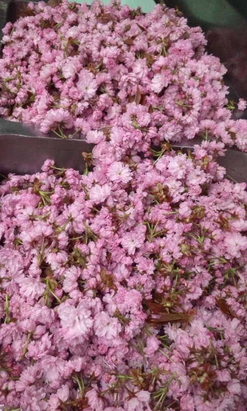 八重桜 Posted on 2017.5.14 by 女 将 2 今年も桜茶を作ろうと思い 八重桜を頂いて来ました。 今年の桜は 雪 雨が少なく 寒暖差が有り過ぎたせいなのか? ? 花びらが小さく縮んだ感じです。 でもピンクの色は強く きれいに出来上がりそうです。 ごっちゃんです 大鷲 女将でした