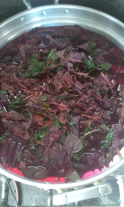 赤じそジュース Posted on 2012.8.24 by 女 将 今年は、赤じそを煮立ててお鍋いっぱい赤じそジュースを作りました。 飲みたい方は声をかけてくださいね(‘-^*)ok クエン酸が入っているので夏の疲れた身体にはとっても優しいですよ。