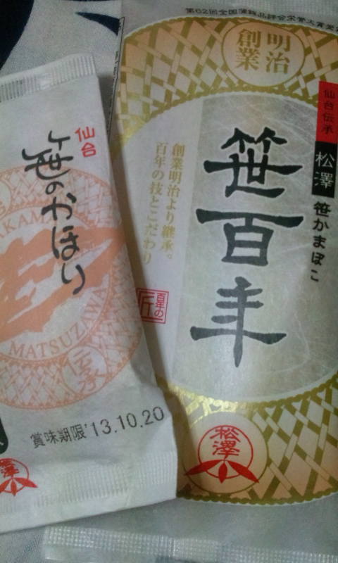今日のお客様 Posted on 2013.10.21 by 女 将 僕は先日楽天イーグルスの応援を兼ねて仙台まで行ってきました もちろんいつもおいしく頂いてる大鷲さんの女将さんへのお土産の笹かまぼこも忘れませんでした 今日もご馳走さまでした! *女将より*仙台からの笹かまぼこご馳走さまでした。 又お待ちしております。ヾ(^▽^)ノ