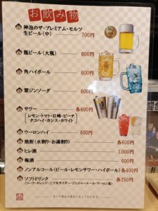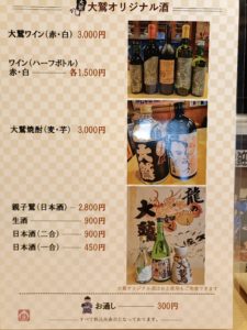お飲み物 品名 値段 大鷲焼酎(麦・芋) 3,000円 大鷲ワイン(白・赤) 3,000円 親子鷲(酒) 2,800円 生酒 800円 日本酒(二合) 700円 その他各種お飲み物をご用意しております(生ビール、ビンビール、焼酎、サワー・カクテル各種、ハイボール、ヒレ酒、ノンアルコール各種、ソフトドリンク各種など)大鷲オリジナル酒はお土産用もご用意できます。